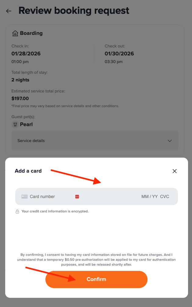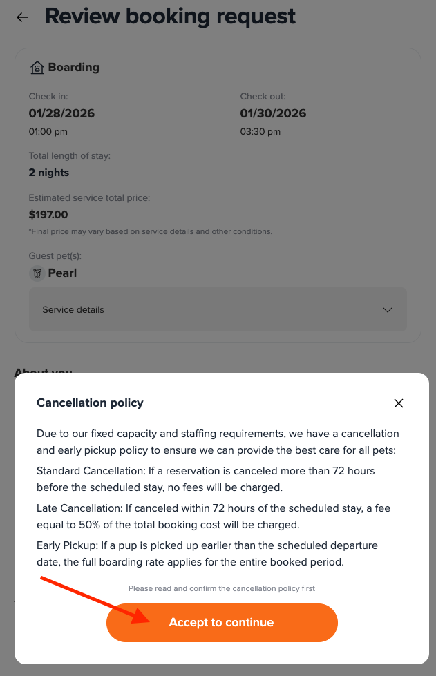 If a payment method is not already saved to your account, you’ll be prompted to add one and accept our cancellation policy before submitting your request.