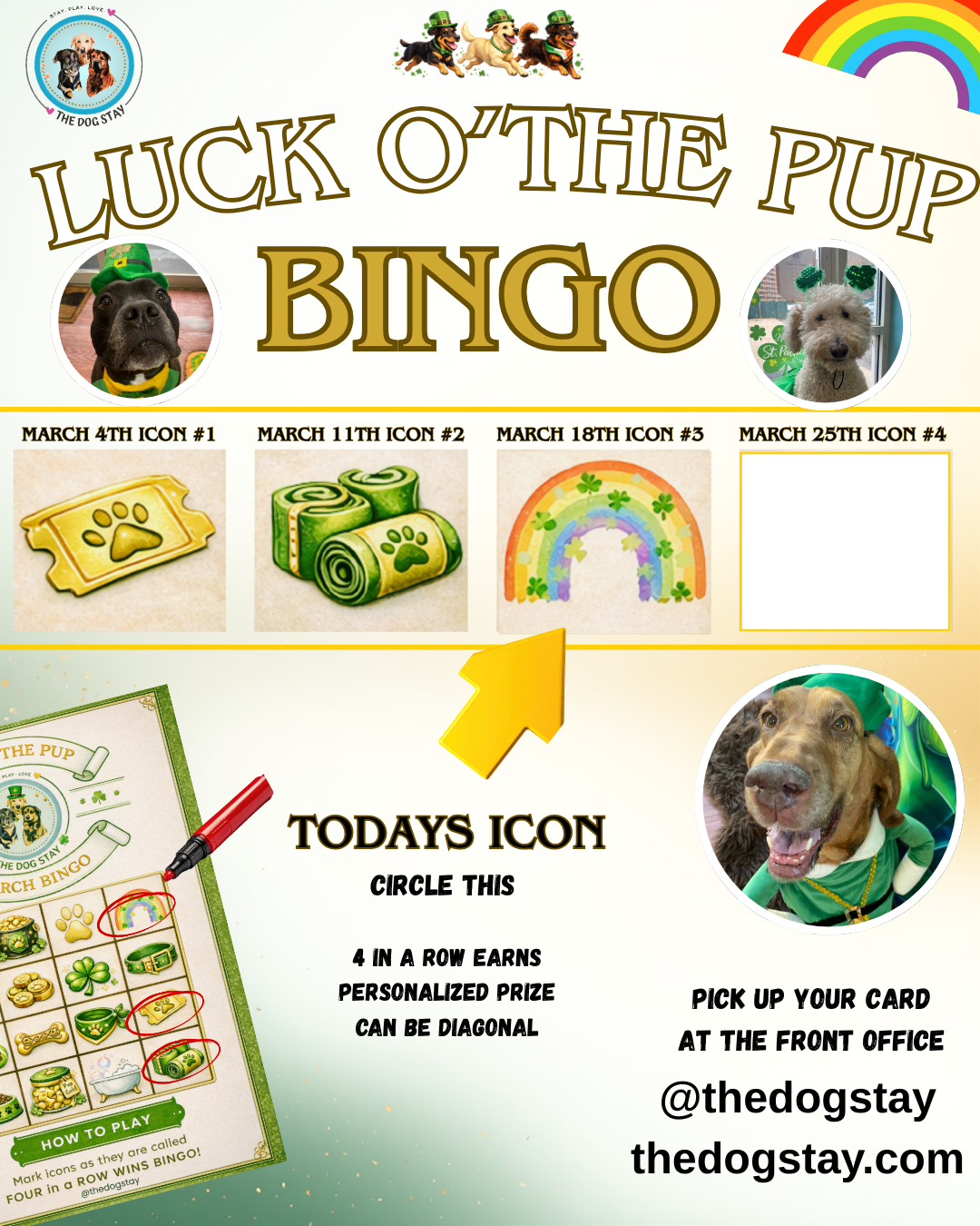 Your pup can pose in our St. Patrickβs-themed photo booth β complete with costumes and a βpot of gold at the end of the rainbow.β Weβll capture adorable moments you wonβt want to miss!